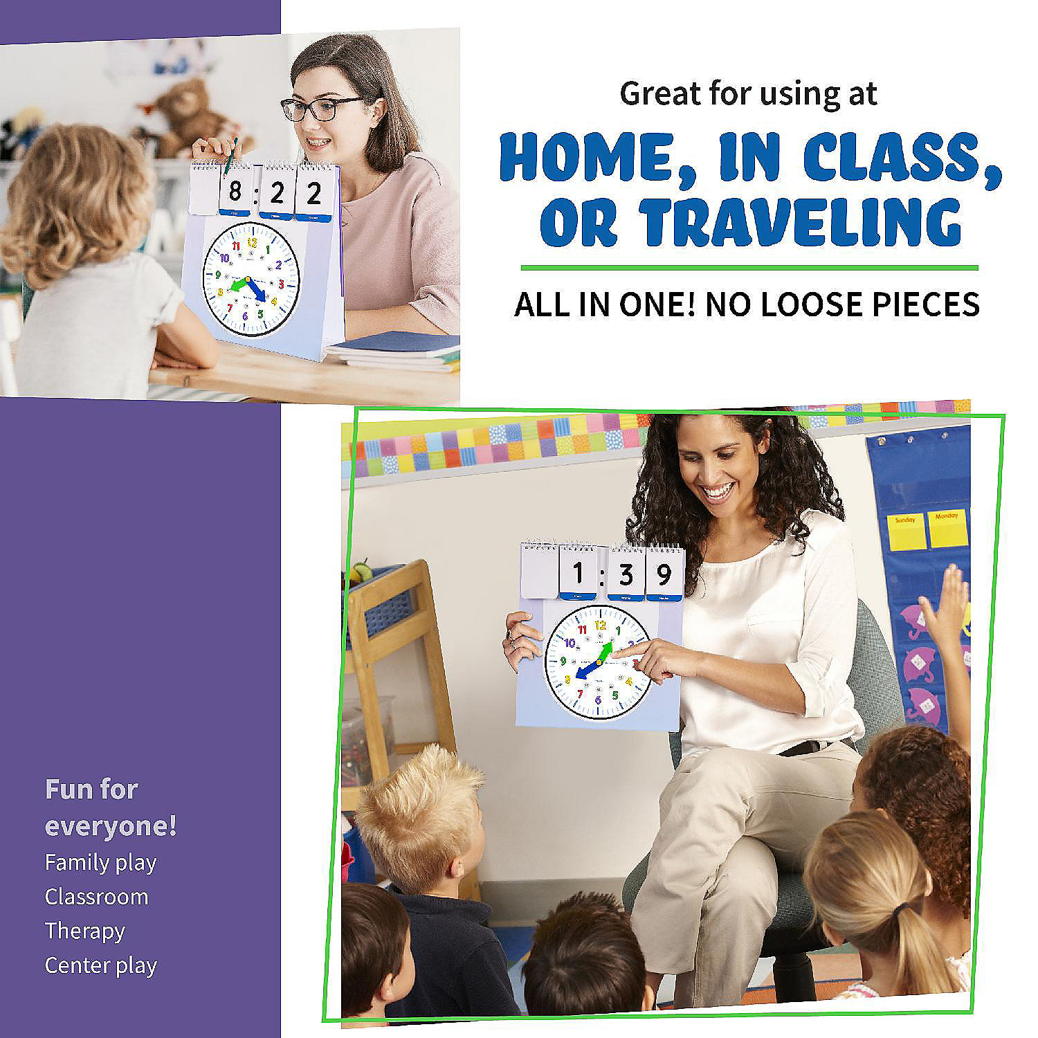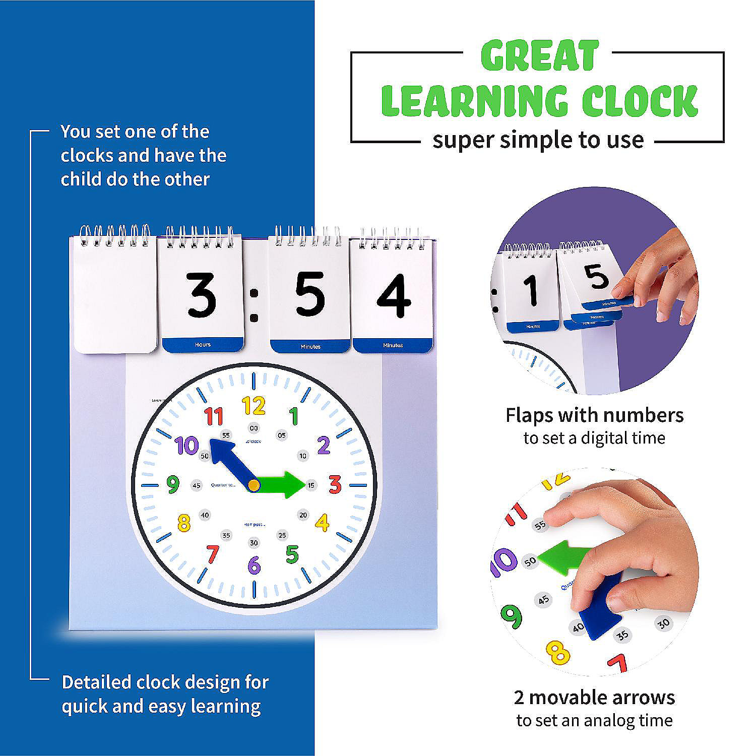 The Teaching Time Clock is a fun and simple tool for teaching kids to tell time. Helps children learn to recognize hands on the clock and corresponding digital times with the help of the beautifully designed flip numbers card. Great for children ages 5 and up, it's perfect for homeschooling or classroom use. Features blank cards for kids to write their own time. Bright and colorful design makes learning fun. The clock is made from durable materials for long-lasting use. This teaching clock is ideal to use at home, schools, therapy centers
