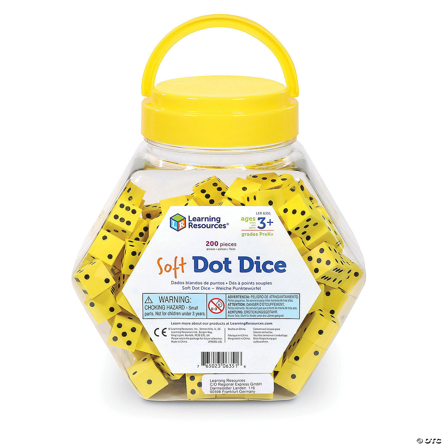 Great for playing classroom games and teaching probability concepts, this set of 200 dot dice is made of washable, durable soft yellow foam. Safe to handle and quiet when rolled. Dice feature dots 1—6 and store in a jar. Special Shipping Information: This item ships separately from other items in your order. This item cannot ship to a P.O. Box. Item is not eligible for expedited shipping. You may initiate a return for unused items within 30 days, if the items are in original packaging with all original materials included with the shipment.