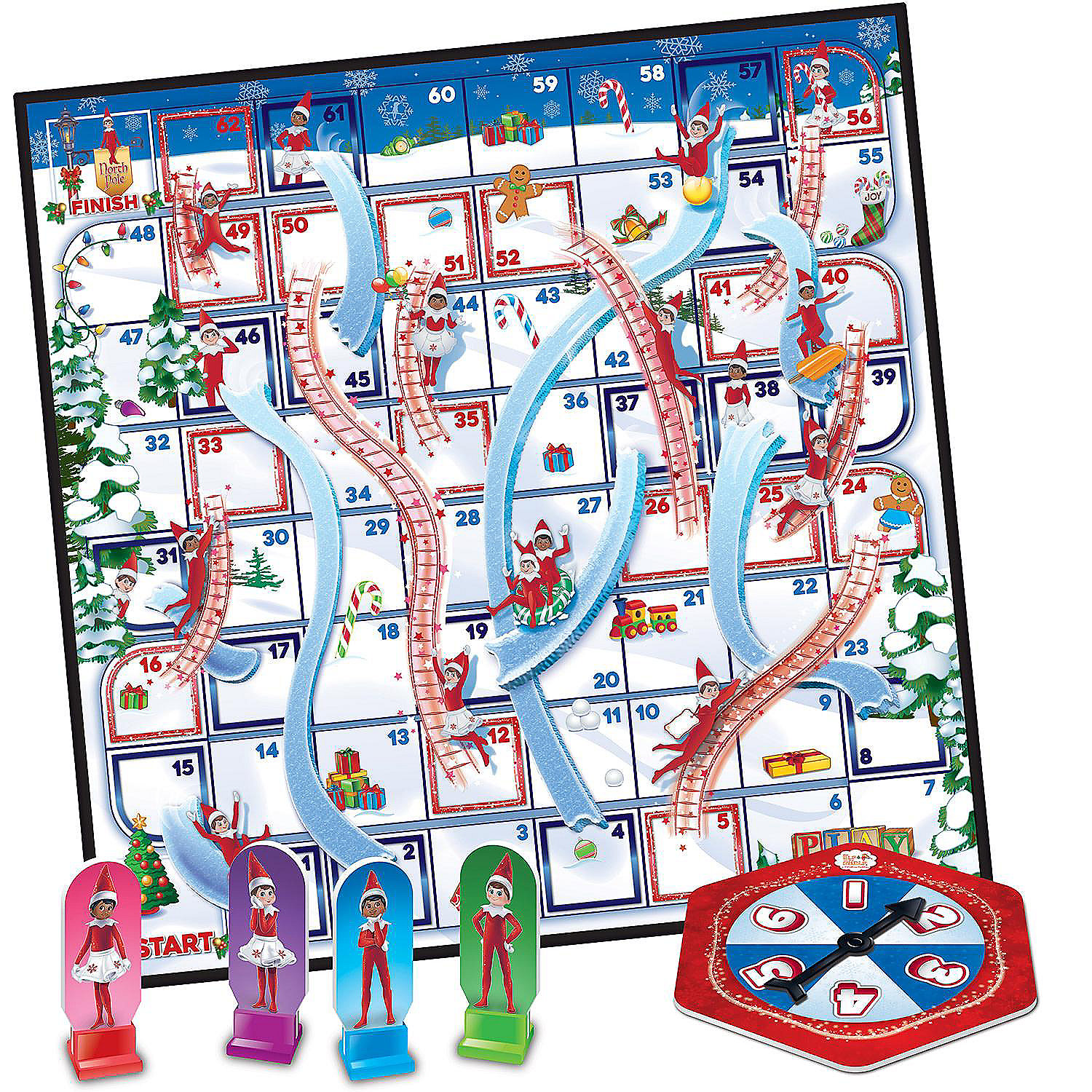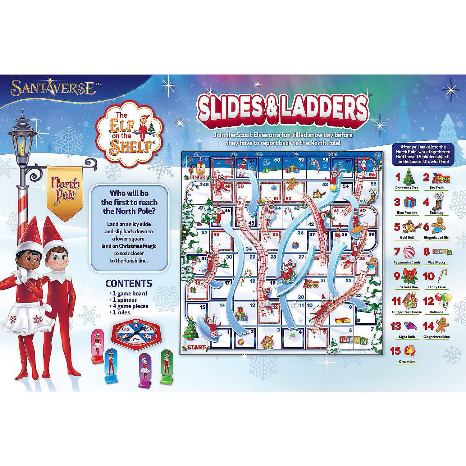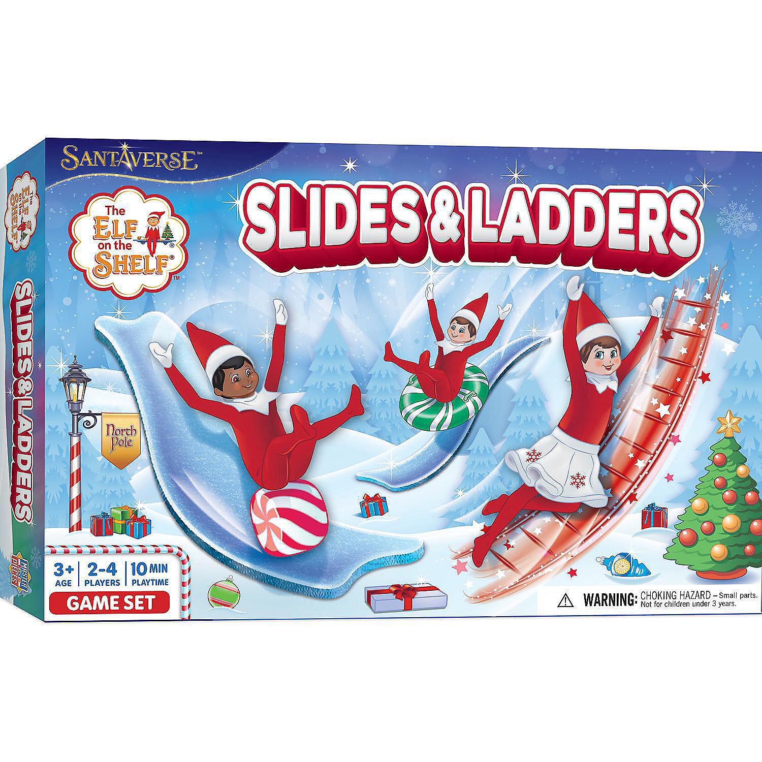 Introducing the SO ELF-DORABLE The Elf on the Shelf Slides & Ladders game by Masterpieces! This classic game of Slides and Ladders is a great way to spend quality time during Christmas with your family and friends while having SNOW-TASTIC FUN with your favorite Scout Elves. SMALL BUT MIGHTY, players as young as 3 years old will love the brightly colored game board (SHINE BRIGHT), 4 SNOW COOL playing pieces with bases, spinner, and rules. Players will go up and down using the icy slides and Scout Elf Magic ladders. You just have to BELIEVE IN THE MAGIC. After you reach the North Pole at the Finish line, work together with your family to find all of the hidden images listed on the back of the box that are scattered across the gameboard. OH WHAT FUN! Get ready to go on a MAGICAL ADVENTURE with The Elf on the Shelf Slides & Ladders Board Game! This game is recommended for 2-4 players, ages 3+. SKI YA LATER! Officially Licensed The Elf on the Shelf product