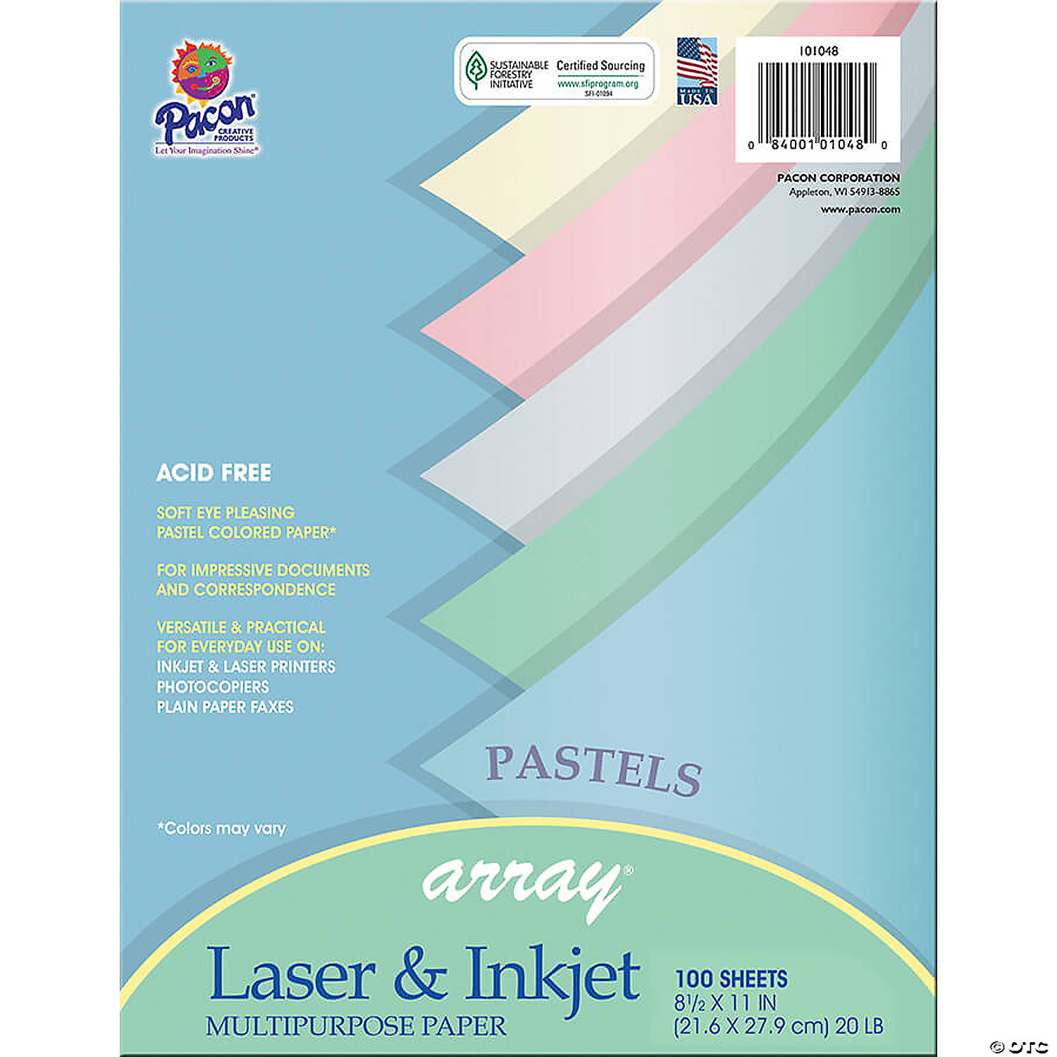Subtle pastel colored paper adds a soft, delicate touch to documents. This 20 lb. paper works well in laser and inkjet printers, photocopiers and offset printers. 5 assorted colors include: Watermelon, Sky Blue, Green, Ivory and Gray. Acid-free and recyclable. Each pack includes 100 sheets. Each sheet measures 8.5" x 11". Sold as 3 packs for a total of 300 sheets. Special Shipping Information: Item ships separately from other items in your order. Item cannot ship to a P.O. Box, APO, or PPO. Item is not eligible for expedited or international shipping. You may initiate a return for unused items within 30 days, if the items are in original packaging with all original materials included with the shipment.