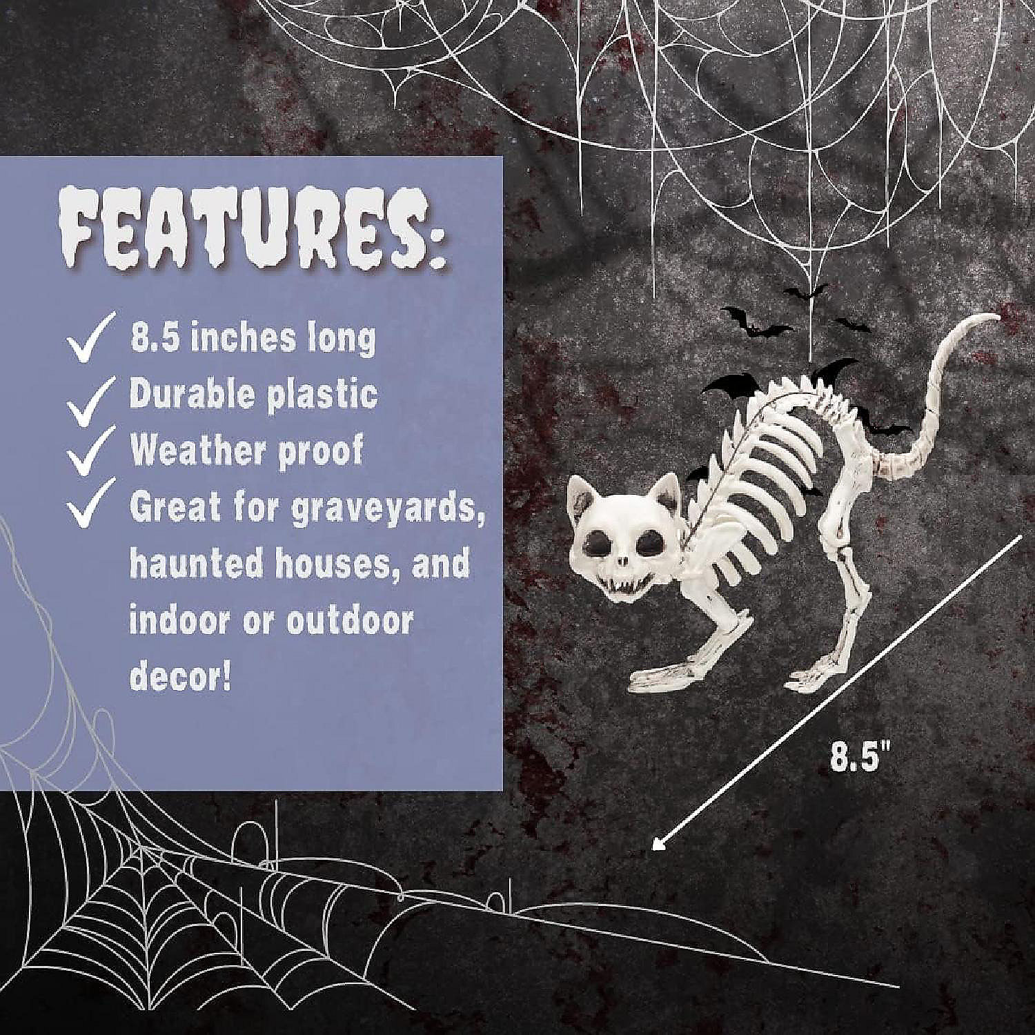 Elevate your Halloween decor with this charming 3-Pack of Kitten Halloween Skeletons. Each skeleton measures a playful 7.5 inches long, making them a delightful addition to your festivities. Crafted from weather-resistant materials, these kitten skeletons are perfect for both indoor and outdoor use, ensuring they endure the elements while maintaining their eerie and whimsical charm. Whether you're setting up a spooky graveyard scene, hosting a fall haunted house party, decorating your home, or enhancing a school classroom, these intricately detailed kitten skeletons will captivate your guests, students, and trick-or-treaters, adding a unique and playful twist to your Halloween ambiance. Make this Halloween unforgettable with these adorable and weather-resistant yard decorations.