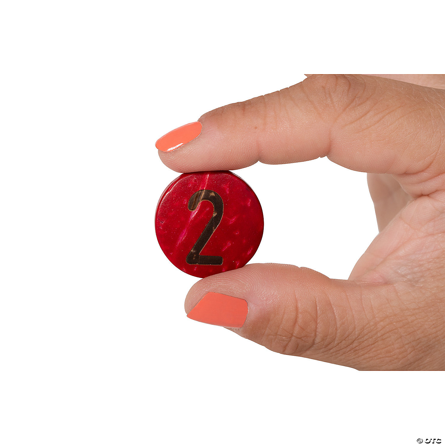 This set includes 100 brightly colored, circular coconut shell pieces with 10 sets of numbers 0-9 etched into the surfaces. Colors include blue, green, red, yellow and pink. Use these number chips as a hands-on resource for a range of activities including number recognition, counting and place value. The coconut shells are cut, cleaned and polished by hand and the pieces retain the concavity of the original coconut shape. They are naturally very strong and durable. Pieces are coated with non-toxic paint. Color quantities may vary. For ages 3+. Size: 1" dia. Special Shipping Information: Item ships separately from other items in your order. Item cannot ship to a P.O. Box, APO, or PPO. Item is not eligible for expedited or international shipping. You may initiate a return for unused items within 30 days, if the items are in original packaging with all original materials included with the shipment.