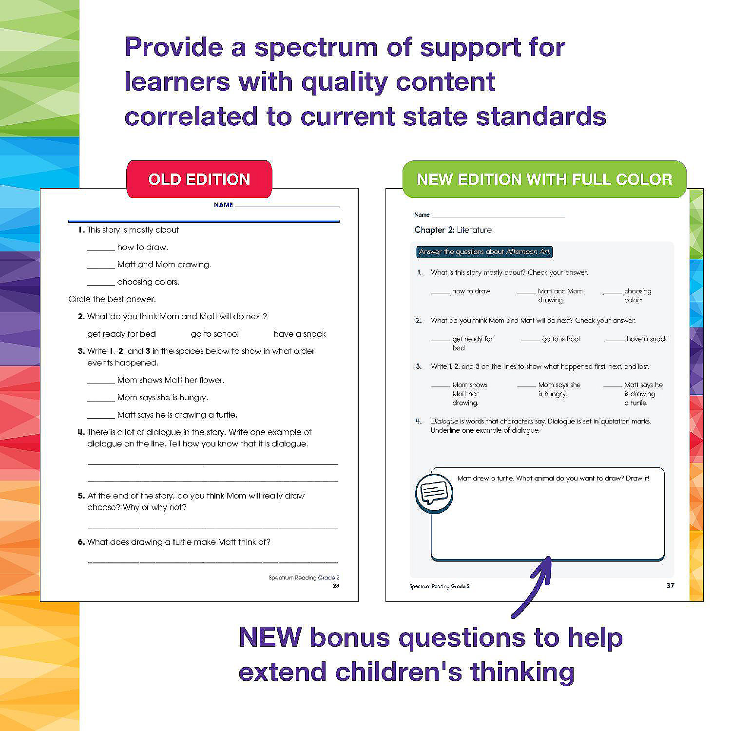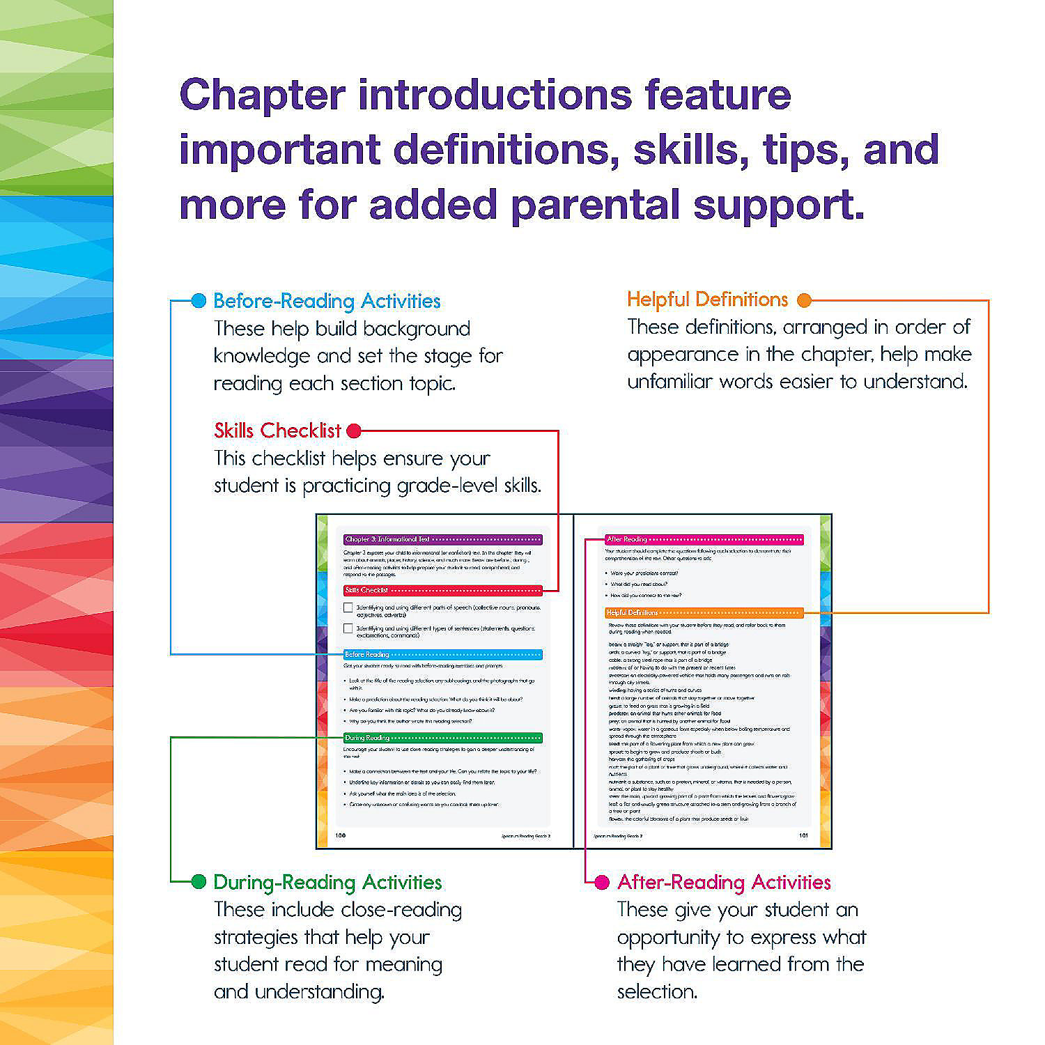 2nd grade reading books Support your child's reading journey with the Spectrum Grade 2 Reading Workbook! Spectrum's second grade reading books are a great way for your child to learn reading skills through a variety of activities that are both fun AND educational! Why You'll Love This Second Grade Workbook Engaging and educational reading passages and activities. Nonfiction and fiction passages with activities to identify main idea and story structure help inspire learning into your child's classroom or homeschool curriculum. Helping your child along the way. Lesson reviews test your child's knowledge before moving on to new and exciting lessons. Parent support pages are included at the beginning of each chapter with helpful definitions, tools and tips, and a skills list to provide a spectrum of support for your leaner. An answer key is included in the back of the 2nd grade workbook to track your child's progress and accuracy. Practically sized for every activity. The 192-page reading comprehension 2nd grade workbook is sized at about 8" x 11"--giving your child plenty of space to complete each exercise. About Spectrum For more than 20 years, Spectrum resources have provided a spectrum of support to meet the individual needs of learners! Whether it is at home or in the classroom, Spectrum's research-supported instruction and activities provide additional practice with grade-level concepts to reiterate skills, support existing curricula, and close learning gaps.