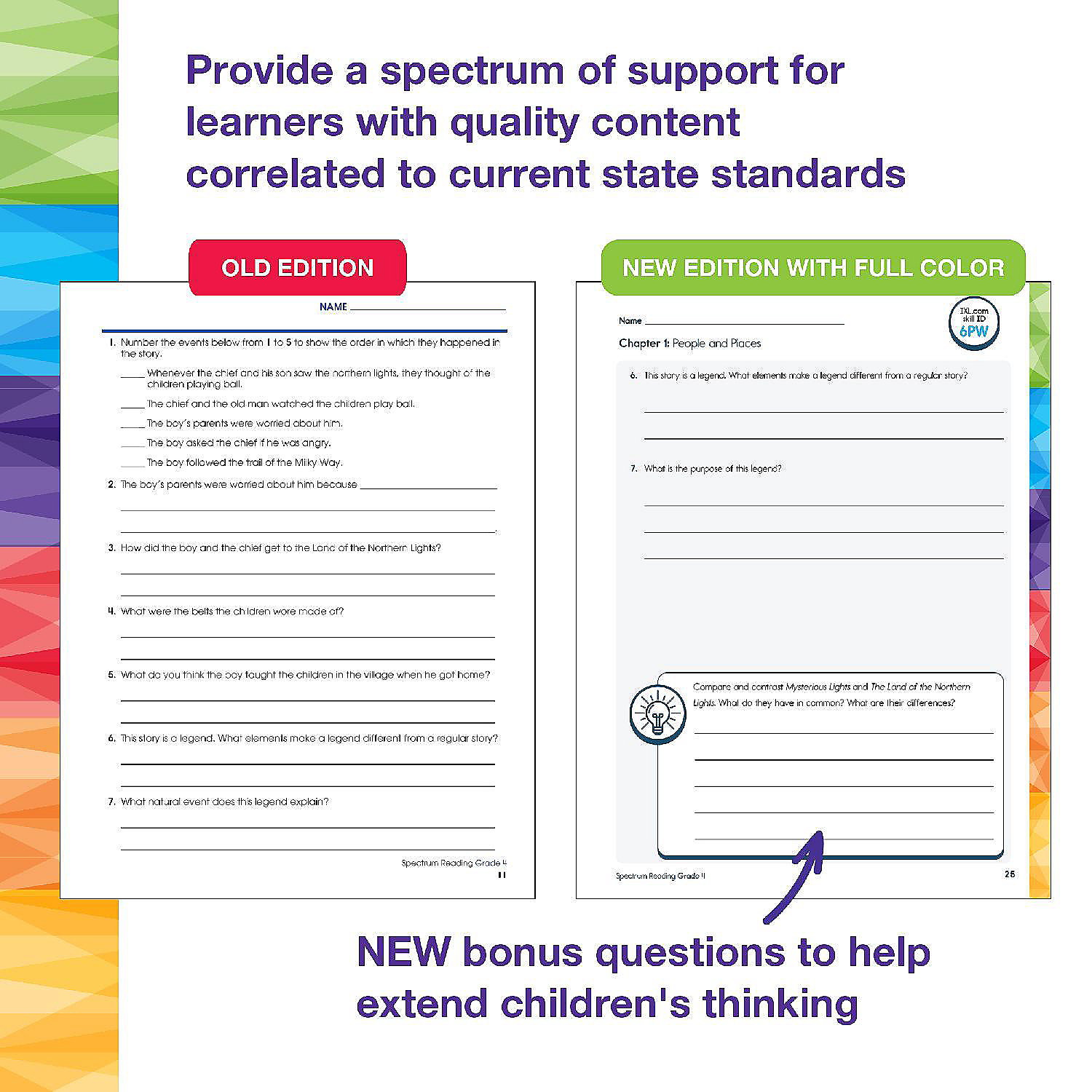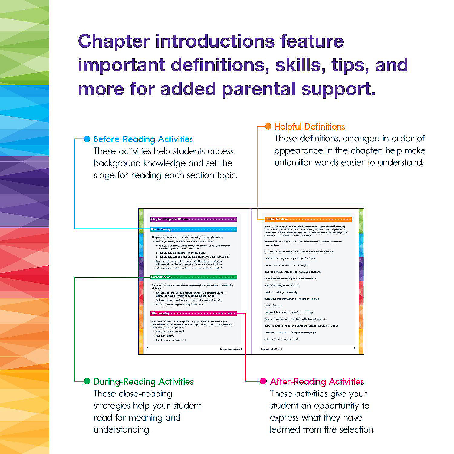4th grade reading books Support your child's reading journey with the Spectrum Grade 4 Reading Workbook! Spectrum Reading Comprehension Grade 4 workbook is a great way for your child to learn reading skills through a variety of activities that are both fun AND educational! Why You'll Love This 4th Grade Workbook Engaging and educational reading passages and activities. Nonfiction and fiction passages with activities to identify themes and summarize passages help inspire learning into your child's classroom or homeschool curriculum. Helping your child along the way. Lesson reviews test your child's knowledge before moving on to new and exciting lessons. Parent support pages are included at the beginning of each chapter with helpful definitions, tools and tips, and a skills list to provide a spectrum of support for your leaner. An answer key is included in the back of the workbook to track your child's progress and accuracy. Practically sized for every activity. The 192-page reading comprehension 4th grade workbook is sized at about 8" x 11"--giving your child plenty of space to complete each exercise. About Spectrum For more than 20 years, Spectrum resources have provided a spectrum of support to meet the individual needs of learners! Whether it is at home or in the classroom, Spectrum's research-supported instruction and activities provide additional practice with grade-level concepts to reiterate skills, support existing curricula, and close learning gaps.