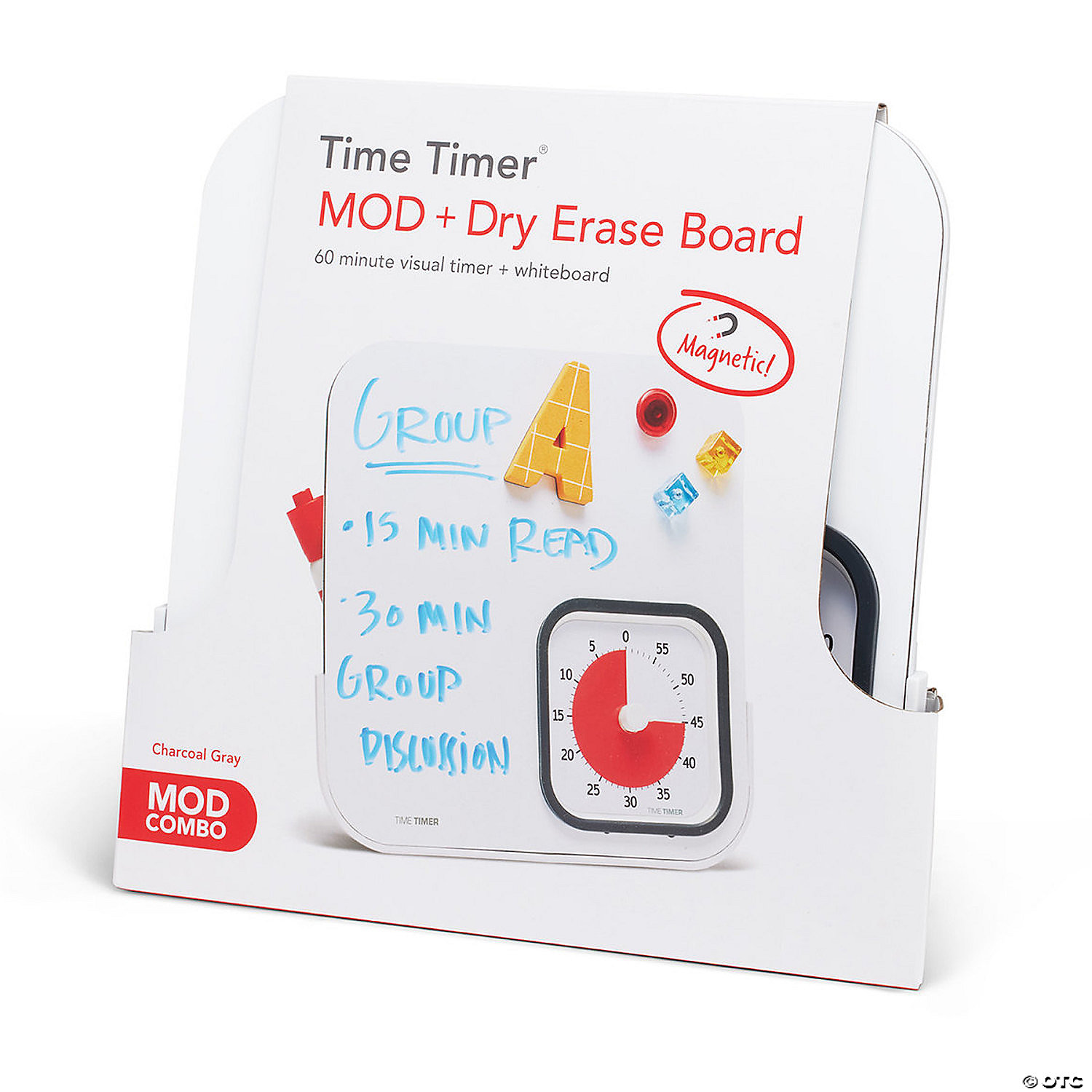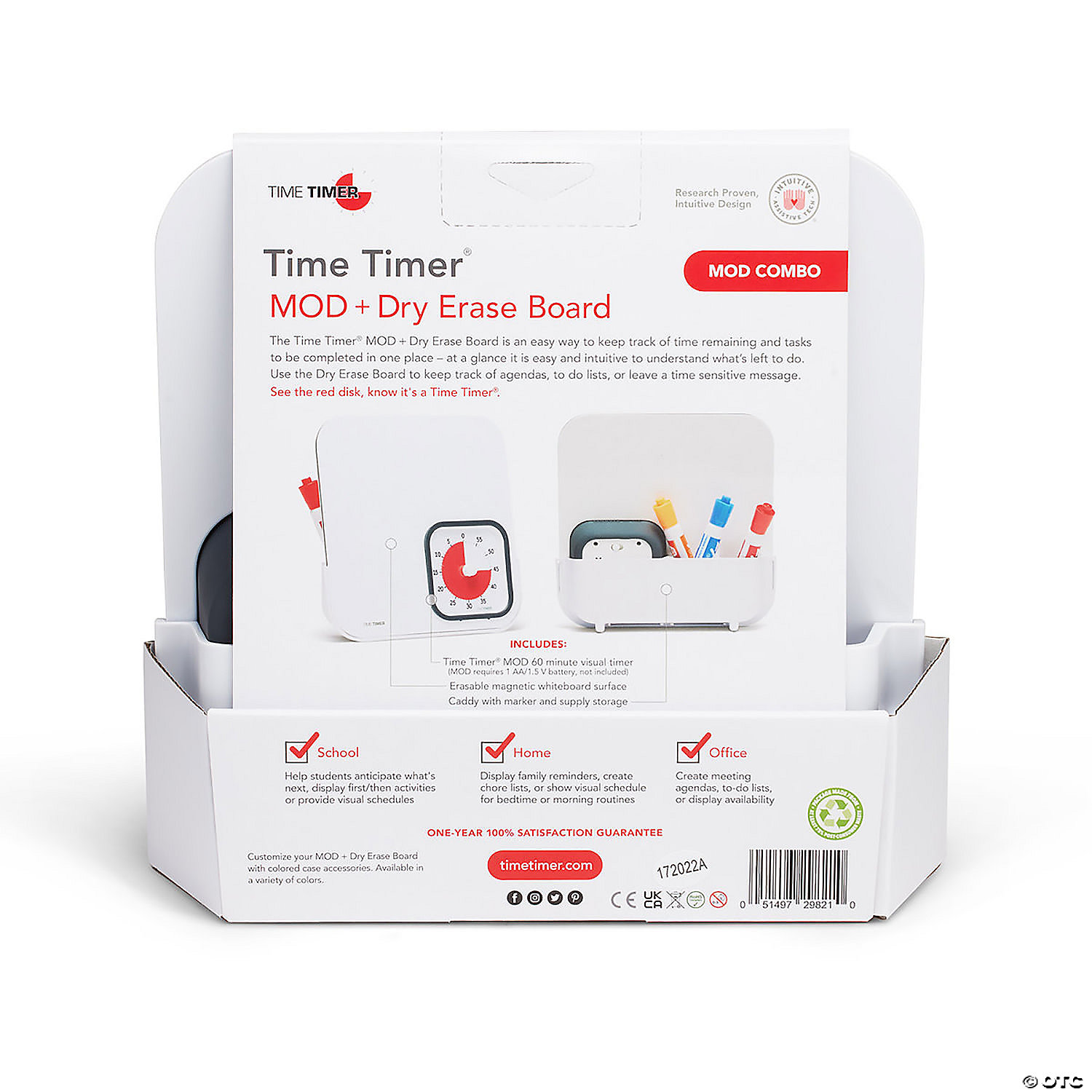 The Time Timer MOD + Dry Erase Board is a magnetic dry erase board combined with a 60-minute visual timer. The color disk on the timer and the writable dry erase surface of the desktop-sized board makes it easy to keep track of time and tasks to be completed in one place. Store supplies in built-in caddy on back. No ticking, alert optional. One-Year 100% Satisfaction Guarantee. Includes 60 minute visual timer, charcoal gray silicone MOD cover and magnetic dry erase board. MOD timer requires 1 AA/1.5V battery (not included). Special Shipping Information: Item ships separately from other items in your order. Item cannot ship to a P.O. Box, APO, or PPO. Item is not eligible for expedited or international shipping. You may initiate a return for unused items within 30 days, if the items are in original packaging with all original materials included with the shipment.