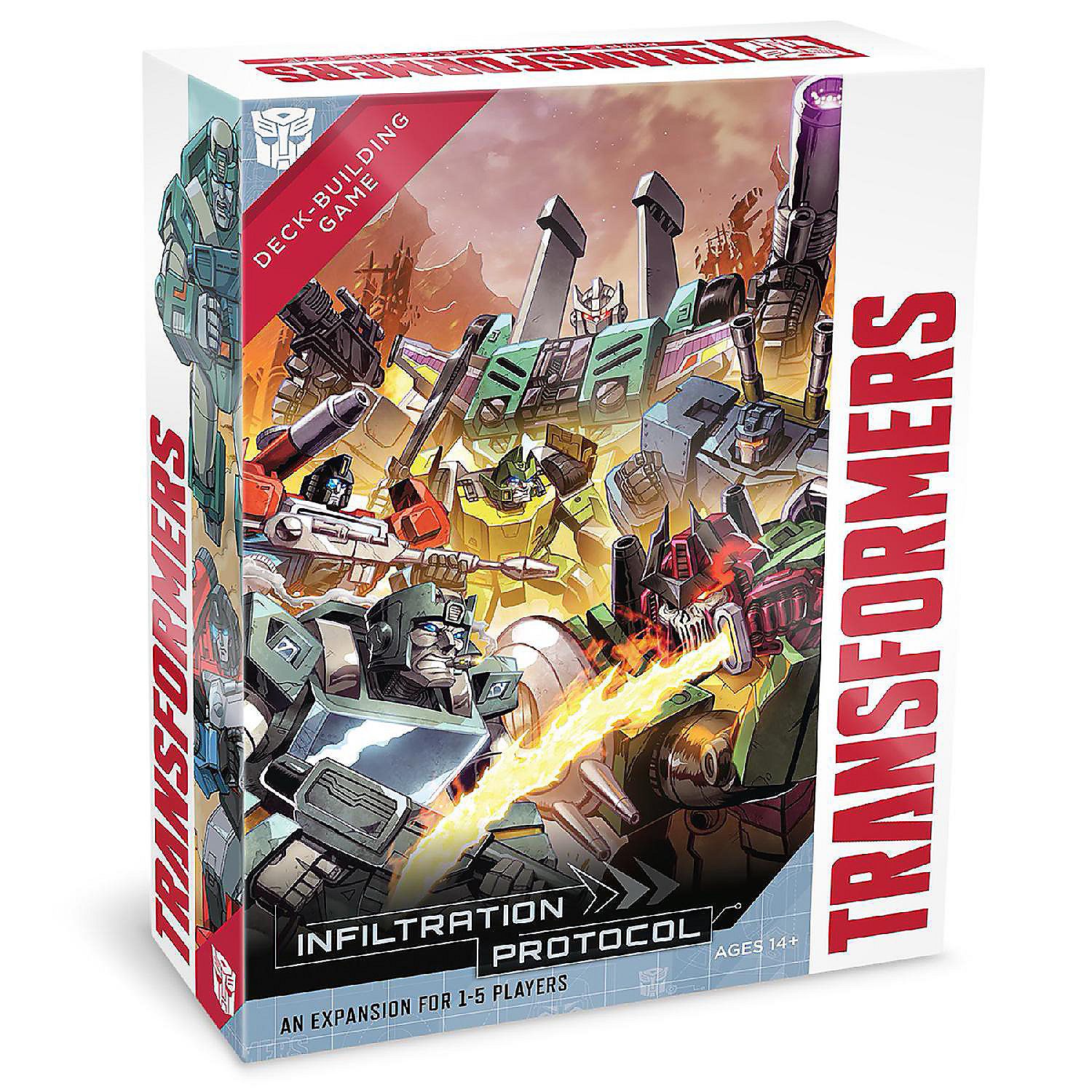 Infiltrate. Escalate. Annihilate. The Decepticons Have Enacted The Infiltration Protocol—A Six-Stage Plan To Destabilize And Conquer New Worlds. Luckily, The Wreckers Are Here To Stop Them! This Expansion Brings New Cards And Ways To Play The Game: One Versus Many And An Objective-Focused Game Mode, The Infiltration Phase Variant! Race To Complete Objectives! This Is An Expansion. Transformers: Deck-Building Game Core Set Or Transformers Deck-Building Game: A Rising Darkness Is Required To Play. Allows You To Play One Versus Many And Team Versus Team Game Mode. Ages 14+, 1-5 Players, 45-90 Minutes. Components: 52 Player Cards, 9 Oversized Character Cards, 6 Player Standees, Rulebook, 12 Infiltration Protocol Cards.