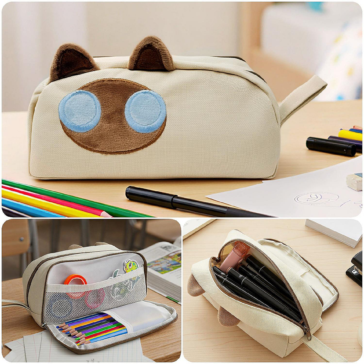 Bring a touch of adorable charm to your everyday organization with our 3D Cat Design Pencil Case. Crafted from durable canvas, this large-capacity pouch features a delightful cat-inspired design complete with 3D embroidered eyes, ears, and paws that make it as fun as it is functional. With two spacious compartments, it's perfect for keeping all your essentials neatly organized; use the main front compartment for larger items like calculators, rulers, and markers, while the back compartment with a mesh pocket keeps pens, erasers, and sticky notes in place. Beyond stationery, this versatile case doubles as a cosmetic bag for makeup brushes, lipsticks, and powders, a travel pouch for toiletries, or even as an electronics organizer for cables, chargers, and flash drives. A side strap makes it easy to carry wherever you go. Adorable 3D Cat Design: Features cute, embroidered 3D details including eyes, ears, and paws. The playful cat shape adds a fun and charming touch to your stationery supplies.Large Capacity Storage: Designed with 2 roomy compartments to keep items organized. The front main compartment holds larger tools like calculators, rulers, and markers, while the back compartment with a mesh pocket stores pens, erasers, and sticky notes.Multifunctional Use: Perfect for multiple purposes; use it as a pencil case for stationery items, a cosmetic pouch for brushes and makeup, a travel pouch for toiletries, or an electronics organizer for cables, chargers, and flash drives.Durable and Portable: Made of sturdy canvas material for long-lasting use. Includes a convenient side strap for easy carrying, travel, and on-the-go organization.Practical Size: Measures approximately 8.6L x 2.25W x 4H inches. Please refer to the size chart for exact dimensions.