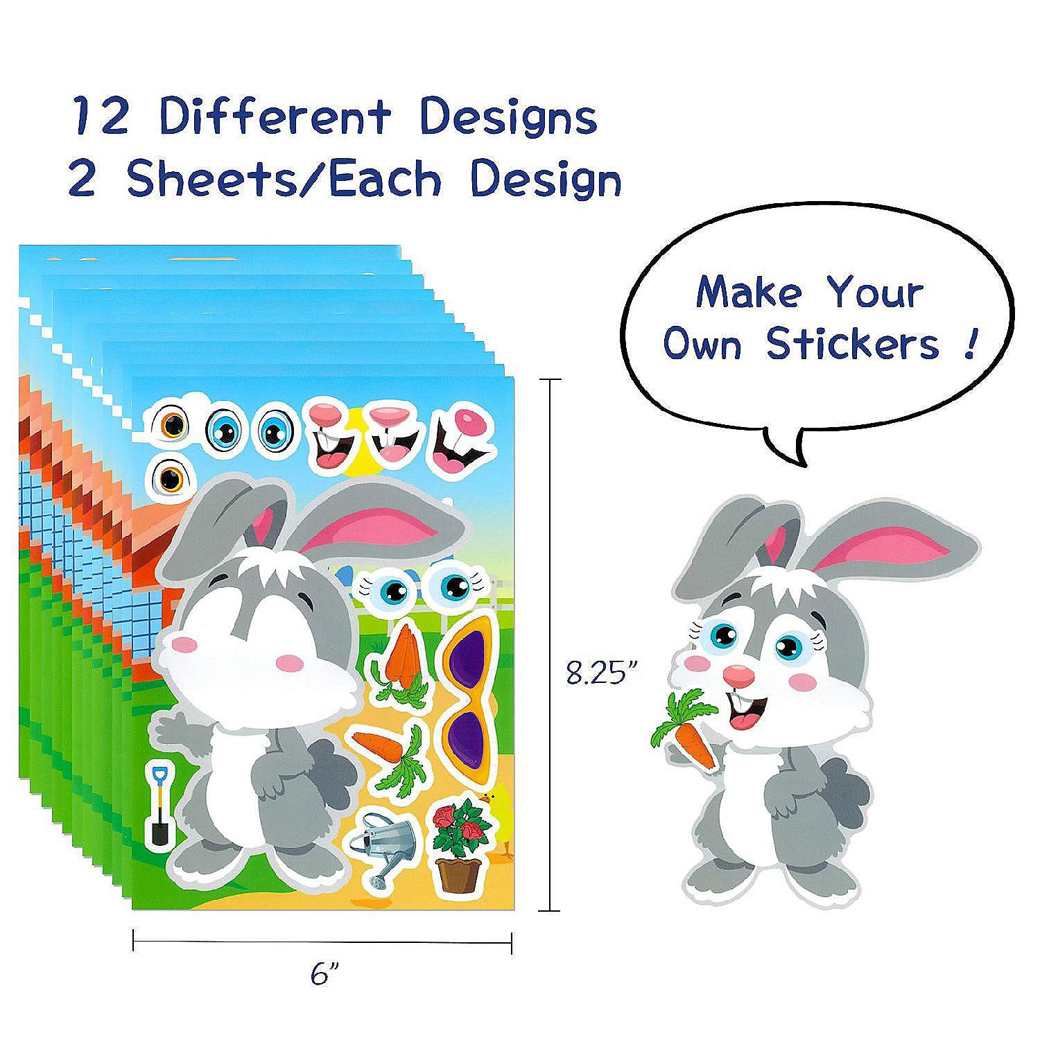 Explore the world of creativity with our Make a Face Sticker. Mix and match between the different stickers to create your own unique sticker. Afterwards, use the finished stickers to decorate your home; stick them on walls, refrigerators, windows, doors, or balloons. They're also perfect for scrapbooks, greeting cards, gift bags, and boxes, and DIY crafting activities. Get in touch with your creative side with these delightful stickers; they make fantastic party favors and entertaining party games. Made with durable vinyl, the stickers are waterproof and do not tear easily.Includes: Set comes with 24 sheets total (Donuts set comes with 27 sheets), various designs per set. Each set has a different theme; choose from animals, food, vehicles, princesses, and more. Each set sold separately.Designs: Each set comes in various designs that allow you to mix and match. Choose from the different facial features and accessories between the sticker sheets to create your sticker masterpiece.Use: An entertaining DIY craft activity. Have fun creating your own sticker with our make-your-own sticker sheets. Adhere the finished sticker on your wall, refrigerator, window, door or balloons as a festive decoration, or use them to decorate scrapbooks, greeting cards, gift bags and boxes. They also make great party favors and a fun party game.Size: Each sheet is 8.25L x 6W inches.Material: Durable vinyl sticker that does not tear easily and is waterproof. Easy to peel off.
